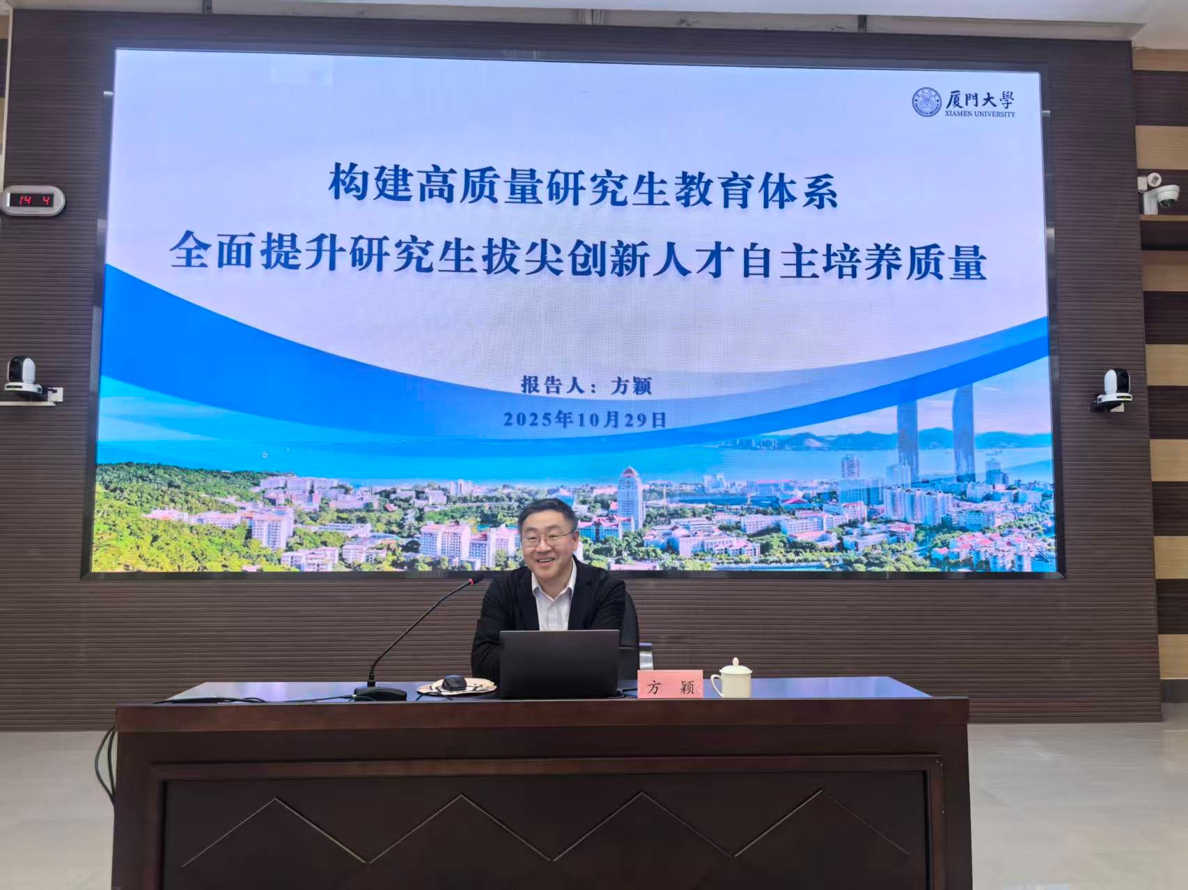 为深入学习党的二十大和党的二十届四中全会精神和全国教育大会精神,贯彻落实习近平总书记关于研究生教育工作的重要指示精神,助力研究生导师深入理解研究生教育政策,加强师德师风教育,明确职业操守与学术规范。10月29日,我校研究生导师(轮训)培训(第一期)正式开班。厦门大学党委常委、副校长、国家杰出青年科学基金获得者方颖教授应邀作专题辅导报告第一讲。校党委常委、副校长黄新华出席开班式并作动员讲话,研究生院全体人员、各培养单位分管院领导、2025年新晋研究生导师参加培训。